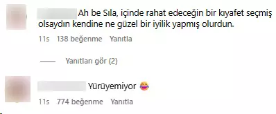 Sıla’nın dar elbisesiyle attığı kontrollü adımlar, gecenin en çok konuşulan detaylarından biri olarak öne çıktı. Hayranlarından bazıları Sıla’nın yürüyüşü ve elbisesiyle ilgili şu yorumlarda bulundu: